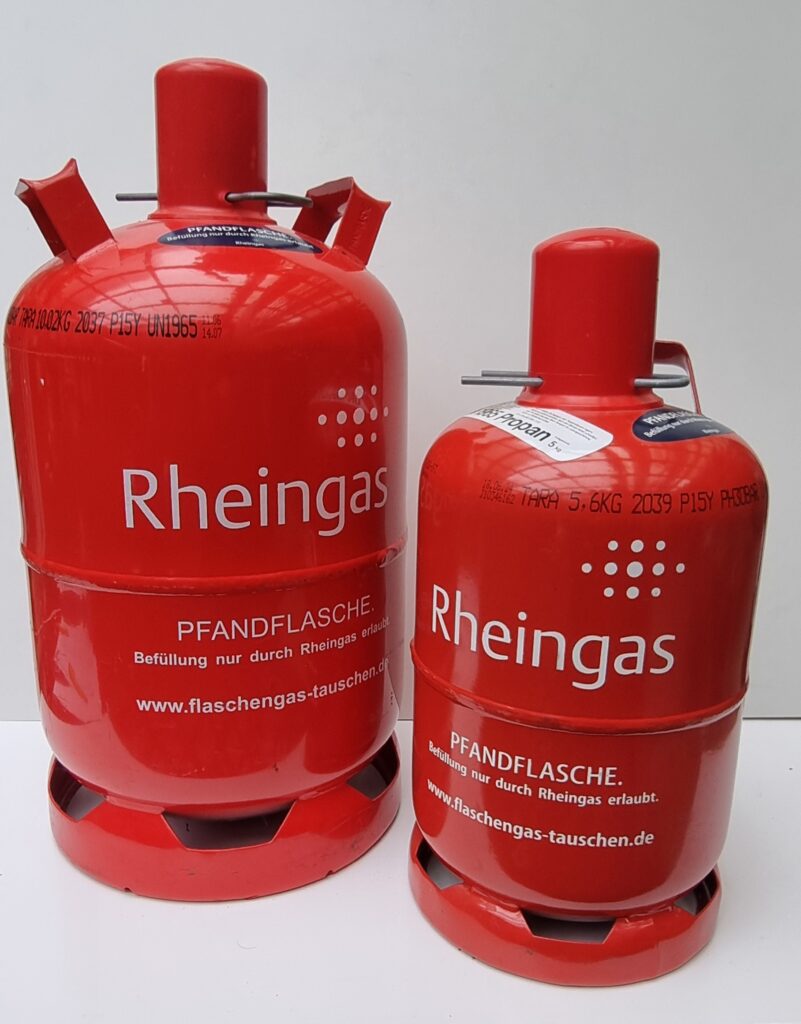 Unser Sortiment umfasst Propangasflaschen (sowohl Pfand- als auch Eigentumsflaschen) der Firma Rheingas mit den Füllmengen: